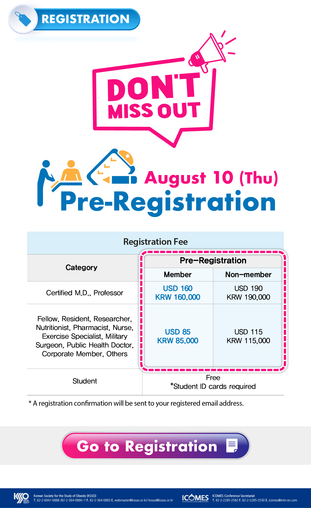 < Korean Society for the Study of Obesity >('http://icomes.or.kr/''hereinafter referred to as 'ICOMES 2021') processes personal information for the following purposes. The personal information being processed is not used for purposes other than the following purposes, and if the purpose of use changes, we will take necessary measures such as obtaining separate consent in accordance with Article 18 of the 「Personal Information Protection Act」.